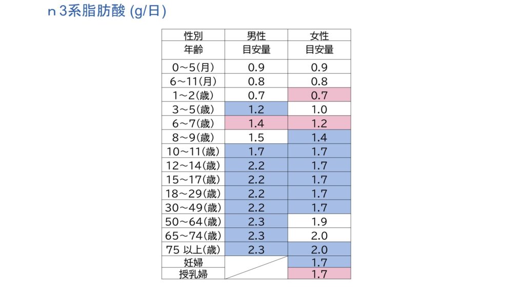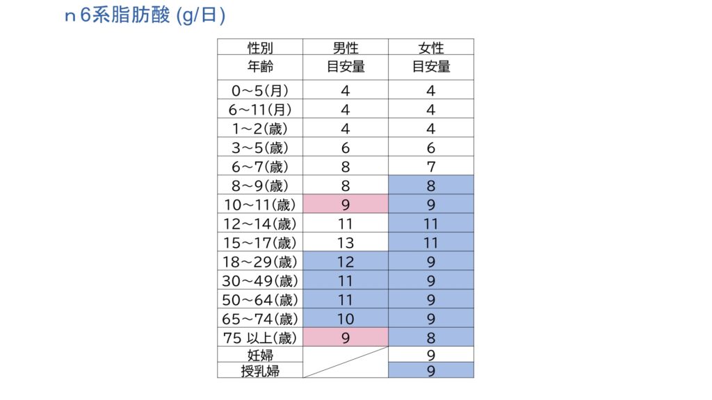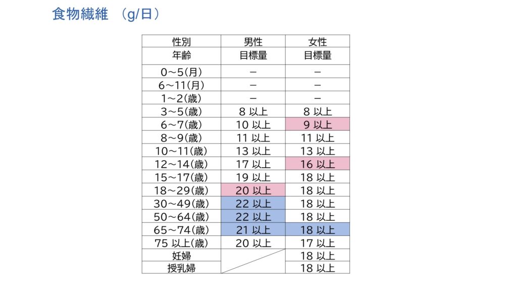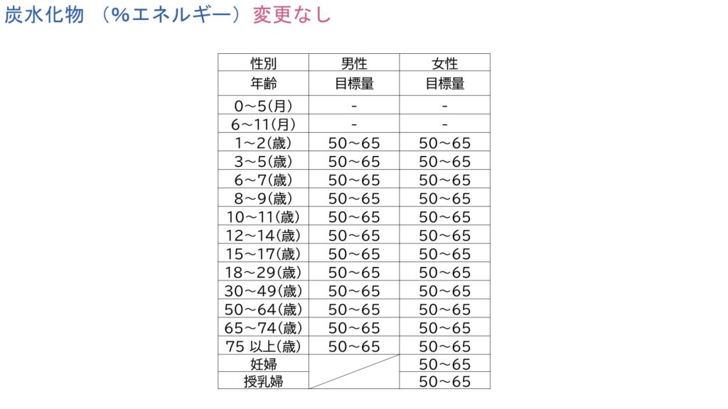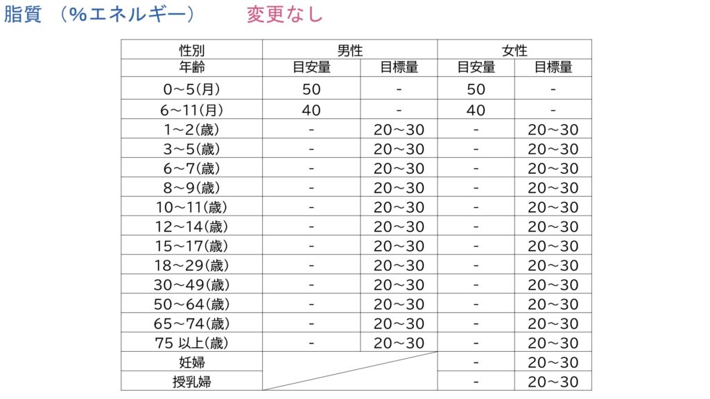 (推定平均必要量、推奨量、目安量:g/日、目標量:%エネルギー)