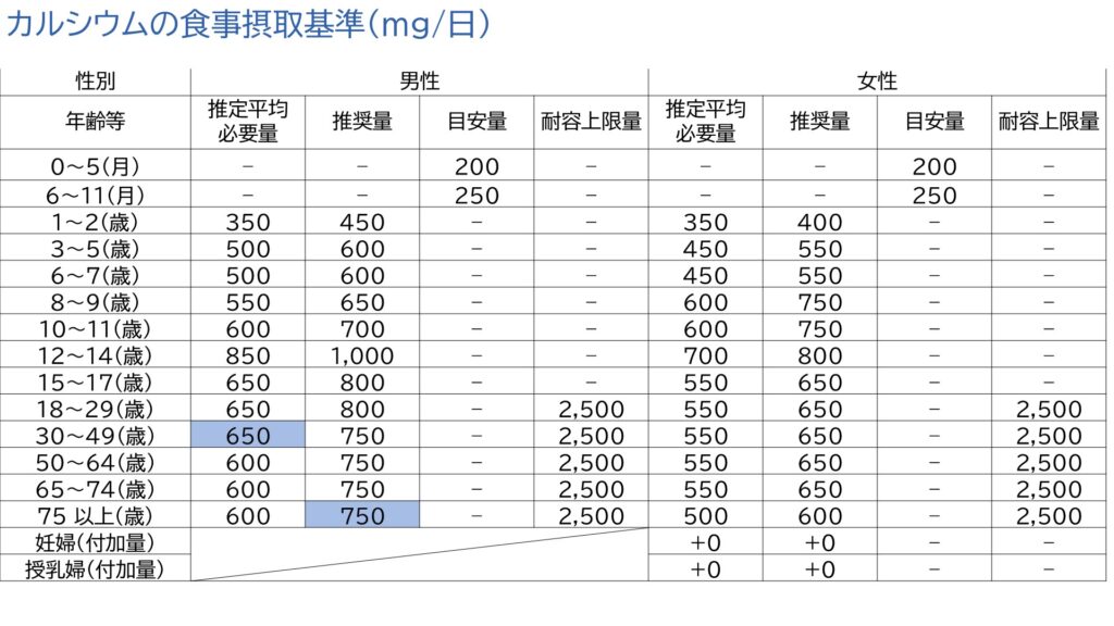 | 30〜49(歳) | 25 | 30 | – | 600 | 20 | 25 | – | 500 |
