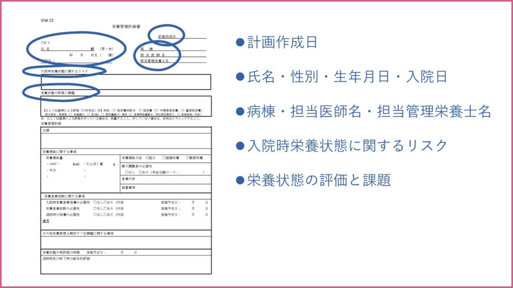 この記事では、まず栄養管理計画書の画像を示して、そこに記された各項目について示していきます